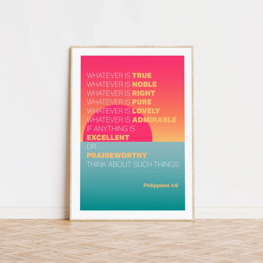 from £9.99Christian themed Ready to Frame art prints. A modern Christian typography poster featuring the words from Philippians 4 verse 8. The full verse rea...